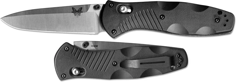 The illustrated Benchmade Knife is the Benchmade Barrage Knife, designed by custom knifemaker Warren Osborne, that features a 3.60″ drop point blade made of 154CM stainless steel, .121″ thick, with a Rockwell hardness of 58-61. The blade of this Benchmade knife has a natural stainless finish, spring assist and ambidextrous thumb stud one hand opening. The contoured black Valox handle, 4.75″ closed, has grooves and notches for secure grip, 420J stainless steel liners for strength and the ambidextrous AXIS Lock. A side to side reversible bright split arrow pocket clip is mounted at the butt end of this Benchmade knife. The Benchmade Barrage Knife with plain edge blade has an overall open length of 8.35″, and weighs 4.20 ounces. Made in the USA.