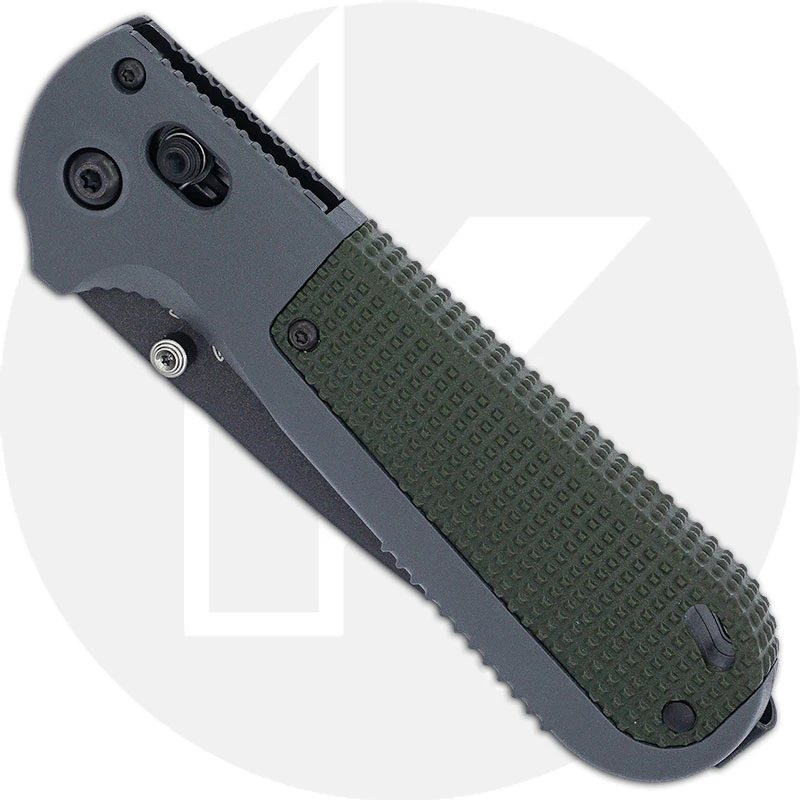 The 430SBK Benchmade Redoubt is a workhorse of an EDC that features a 3.55 inch part serrated drop point blade made of tough CPM-D2 tool steel, with a Rockwell hardness of 60-62. The blade has a non reflective black finish, a top swedge to lessen weight, and dual green thumb studs for ambidextrous one hand opening. The Overlander Gray Grivory® handle, 4.75 inches closed, has ergonomic contours and a textured Forest Green grip for secure purchase, sturdy AXIS Lock, a lanyard hole, and a deep carry black mini clip mounted at the butt end. This Benchmade Redoubt Knife has an overall open length of 8.29 inches. Proudly made in the USA.