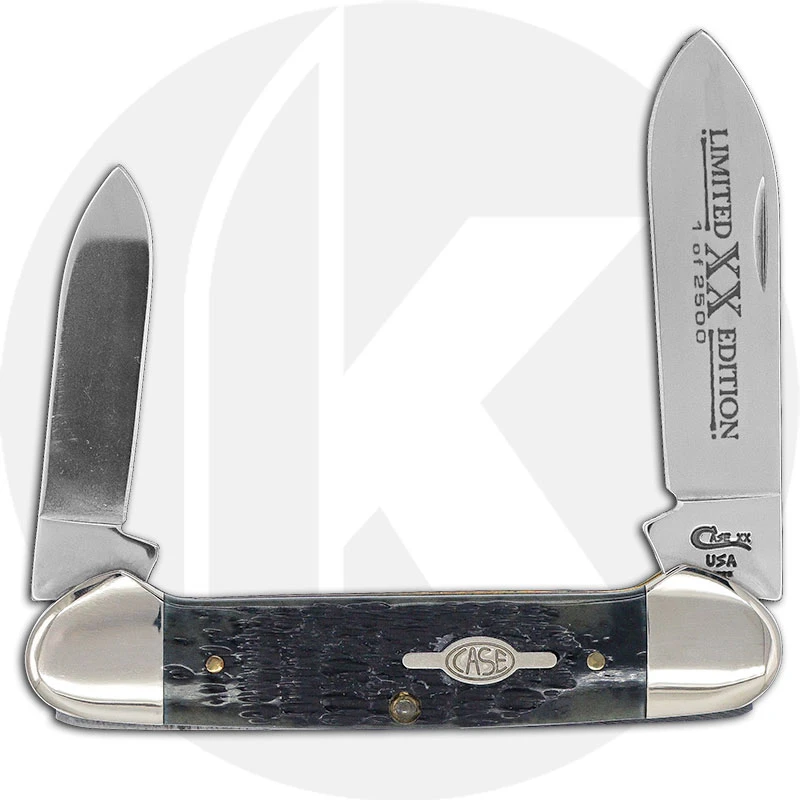 The 04974 Case Limited Edition IV (62131SS) Canoe Knife features a spear blade with Limited XX Edition embellishment and a pen blade made of mirror polished Tru-Sharp Surgical steel, with nail nicks for opening. The Rogers Jig Pitch Black Bone handle, 3 5/8 inches closed, has a Case Saturn Shield and nickel silver bolsters. The Case Canoe Knife weighs 2.0 ounces. Discontinued item, limited to 2500 pieces, BNIB; made in the USA.