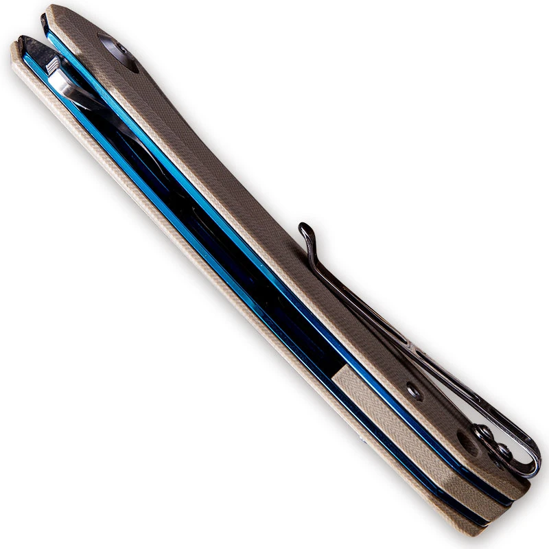 The C801B CIVIVI Baklash is a high quality value price EDC produced by CIVIVI, a subsidiary of WE Knife Company, that features a 3.5 inch drop point blade made of 9Cr18MoV stainless steel, .12 inches thick, with a Rockwell hardness of 58-60, a hollow grind, swedged spine, satin finish, notched thumb rest for secure grip, and a flipper for ambidextrous one hand opening. The tan G10 handle, 4.6 inches closed, has chamfered edges for comfort, pivot with stainless steel ball bearing support for smooth opening, stainless steel liners for strength (in contrasting blue for visual interest), sturdy liner lock, G10 back spacer with lanyard hole, and a side to side reversible deep carry stainless steel pocket clip mounted at the butt end. This WE CIVIVI Baklash Knife has an overall open length of 8.10 inches, and it weighs 3.88 ounces. Made in China.