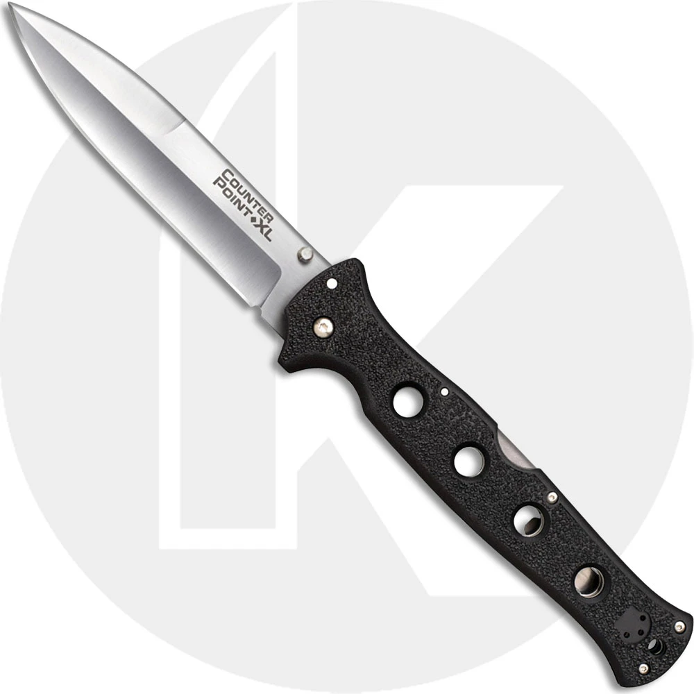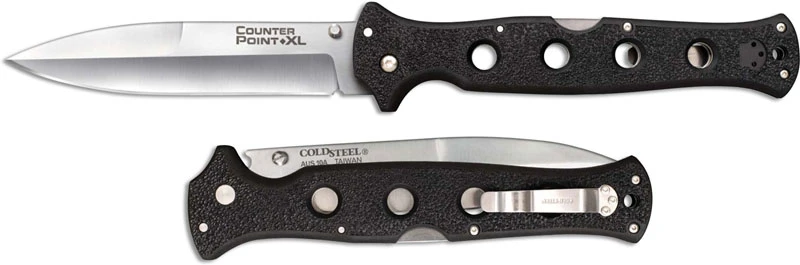 The Cold Steel Counter Point with AUS 10A blade steel! The 10AA Counter Point XL Knife features a 6 inch spear point blade made of AUS 10A stainless steel, 4mm thick, with a satin finish, a swedged tip, and dual thumb studs for ambidextrous one hand opening. The drilled black Griv-Ex handle, 7 1/8 inches closed, has ergonomic contours and checkered texture for secure grip, sturdy Tri-Ad Lock, a lanyard hole, and a side to side reversible pocket clip mounted at the butt end. The Counter Point XL Knife with AUS 10A steel blade has an overall open length of 13 1/8 inches, and it weighs 7.9 ounces. Made in Taiwan.