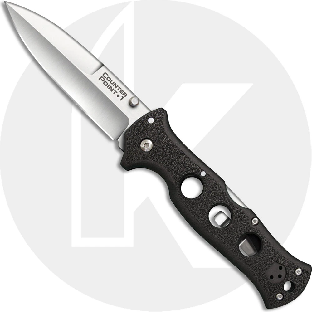 The Cold Steel Counter Point with AUS 10A blade steel! The 10AB Counter Point 1 Knife features a 4 inch spear point blade made of AUS 10A stainless steel, 3.5mm thick, with a satin finish, a swedged tip, and dual thumb studs for ambidextrous one hand opening. The drilled black Griv-Ex handle, 5 inches closed, has ergonomic contours and checkered texture for secure grip, sturdy Tri-Ad Lock, a lanyard hole, and a side to side reversible pocket clip mounted at the butt end. The Counter Point 1 Knife with AUS 10A steel blade has an overall open length of 9 inches, and it weighs 4.7 ounces. Made in Taiwan.