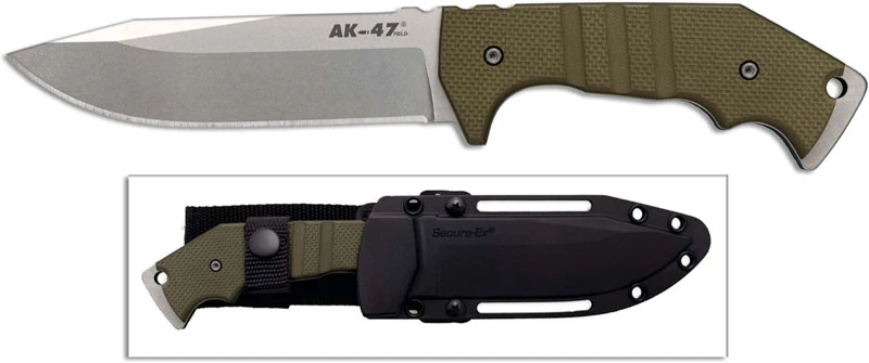 From Cold Steel: Designed by Andrew Demko, the AK-47 Field Knife is enormously sturdy. Expertly crafted from CPM3-V steel, the AK-47 Field Knife with a stonewashed finish from the tip of its beefy saber ground clip point blade through its full tang and integral steel pommel ensuring and hard wearing, super tough finish.Supplied with a versatile Secure-Ex sheath, the AK-47 Field Knife is the perfect companion for today’s modern Military personnel.
