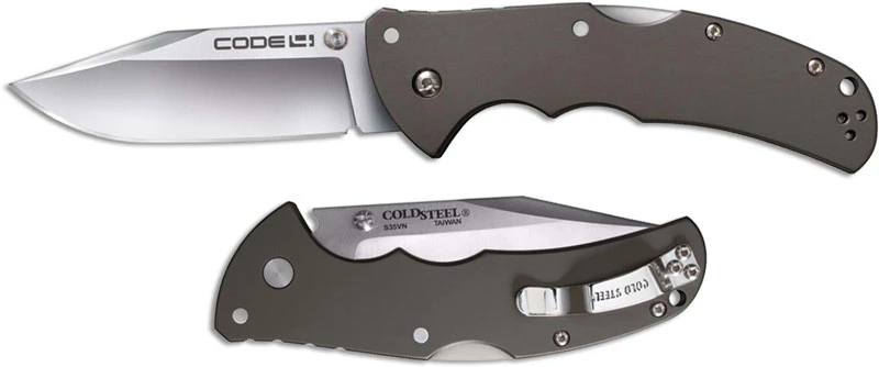 The Cold Steel Code 4 with S35VN blade steel! The 58PC Code 4 Knife features a 3 1/2 inch clip point blade made of S35VN stainless steel, 3.5mm thick, with a satin finish, and dual thumb studs for ambidextrous one hand opening. The slim profile gray 6061 aluminum handle, 5 inches closed, has finger grooves and a notched thumb rest for secure grip, sturdy Tri-Ad Lock, a lanyard hole, and ambidextrous pocket clip mounted at the butt end. The Code 4 Knife has an overall open length of 8 1/2 inches, and it weighs 4.3 ounces. Made in Taiwan.