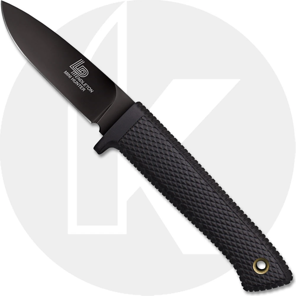 The illustrated Cold Steel Knife is the Cold Steel Pendleton Mini Hunter Knife that features a 3″ drop point fixed blade made of CPM 3-V high carbon steel, 3mm thick, with a non reflective black DLC finish. The black Kray-Ex handle of this Cold Steel Knife has texturing for secure grip, an integral guard and a lined lanyard hole. A Secure-Ex sheath is included with this Cold Steel Knife. The Cold Steel Pendleton Mini Hunter Knife with 3V steel blade has an overall length of 6 5/8″, and it weighs 2.1 ounces.