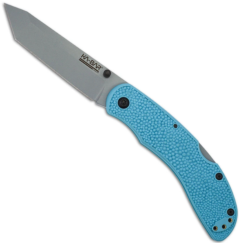 The 5698SF KA-BAR USSF Corser Folder is a value priced EDC that features a 3.5 inch tanto blade made of AUS 8A stainless steel, .114 inches thick, with a Rockwell hardness of 56-58, a flat grind, non reflective gray powder coat and dual thumb studs for ambidextrous one hand opening. The slim, pebbled blue GFN-PA66 handle, 4.375 inches closed, has ergonomic contours for comfort, sturdy lockback and a side to side reversible pocket clip mounted at the butt end. The KA-BAR USSF Corser Folder Knife has an overall open length of 7.875 inches, and it weighs 3.2 ounces. Made in Taiwan.