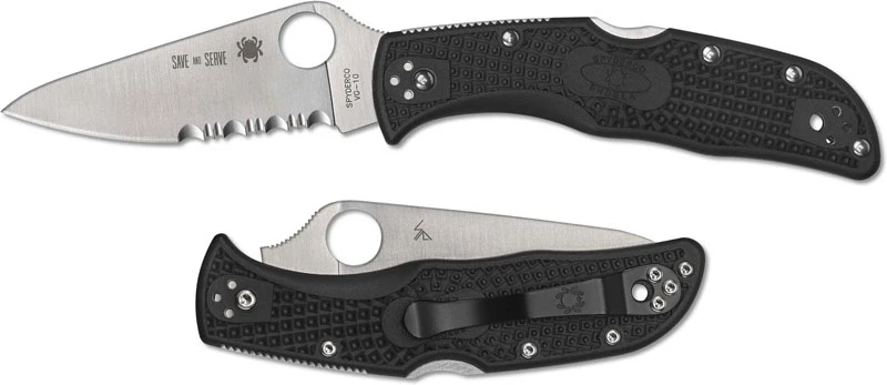 The VG-10 blade of this Endela Lightweight also combines the enhanced edge geometry of a full-flat grind with the voracious cutting power of Spyderco serrations. To honor the selfless service of first responders, every blade is proudly laser engraved with the motto “Save and Serve.” All other features of these elite knives are consistent with the standard version of this model, including a reliable back lock mechanism, skeletonized stainless steel liners, four-position pocket clip, and Bi-Directional Texturing.