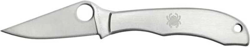 The illustrated Spyderco Knife is the Spyderco HoneyBee Knife that features a 1.6″ blade made of Cr13 stainless steel with Spyderco hole for ambidextrous one hand opening. The contoured stainless steel handle of this Spyderco Knife, 2.06″ closed, has Spyderco Bug detailing and a lanyard/keyring hole. No pocket clip; no lock. The Spyderco HoneyBee Knife has an overall length of 3.66″ when open, and weighs .56 ounce. Imported from China.